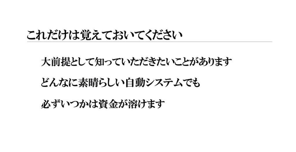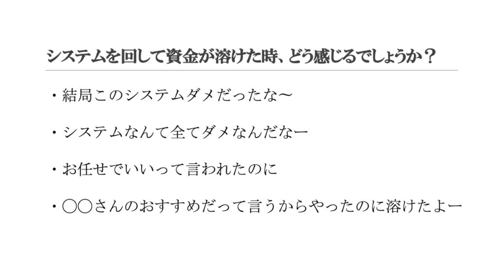 なので、いくら優秀なシステムを使っていてもこういった出来事が生じた場合、ほとんどの確率で資金を溶かしてしまいます。
