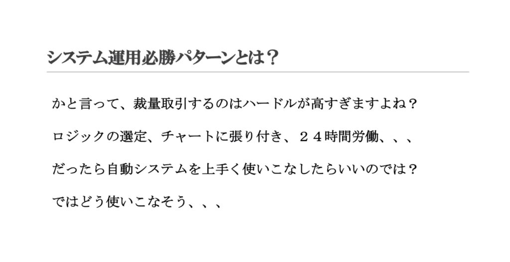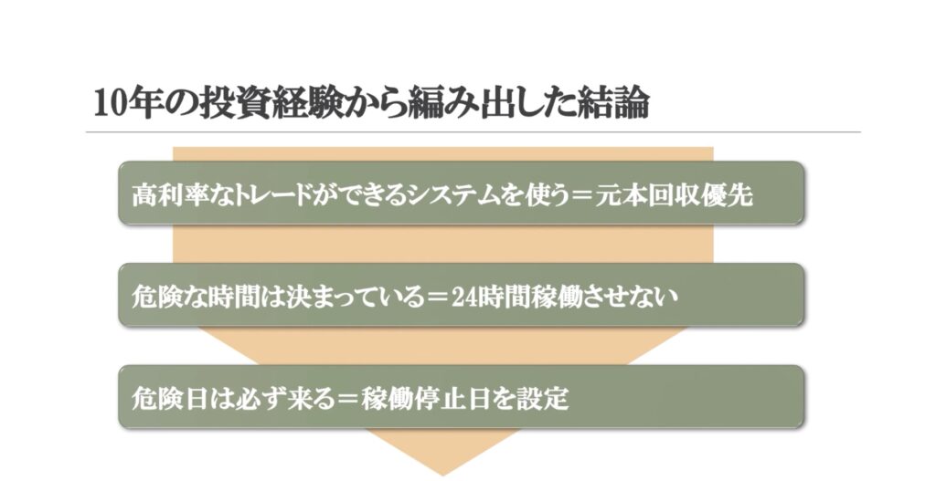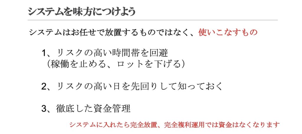 ほとんどのシステムは完全にシステムに任せてしまっているので危険な日時を避けることができずに、途中で資金を溶かしてしまうのです。