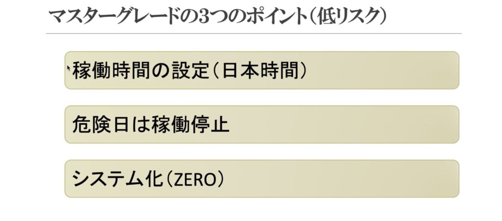 高利率だと危険だと思うかもしれませんが、マスターグレードは他のシステムとは違い、危険な日時に稼働させない方法を取っています。